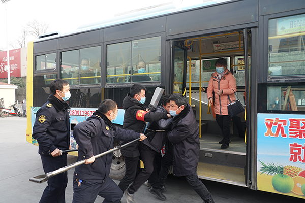 在火車站首末站,恰逢一車隊(duì)工作人員正在開展疫情防控應(yīng)急演練,一未佩戴口罩的乘客欲乘車,駕駛員制止后,該乘客非但不聽,強(qiáng)行上車后辱罵、持刀相向駕駛員,駕駛員隨即將情況報告車隊(duì)長并報警,車隊(duì)安保人員將其制服??赐暄菥毢螅苄l(wèi)軍、錢萬輝對工作人員面對突發(fā)事件的應(yīng)急處置能力點(diǎn)贊。